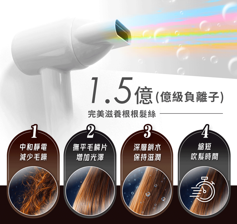 ● 高濃度負離子護髮科技-撫平毛躁,讓秀髮柔順有光澤